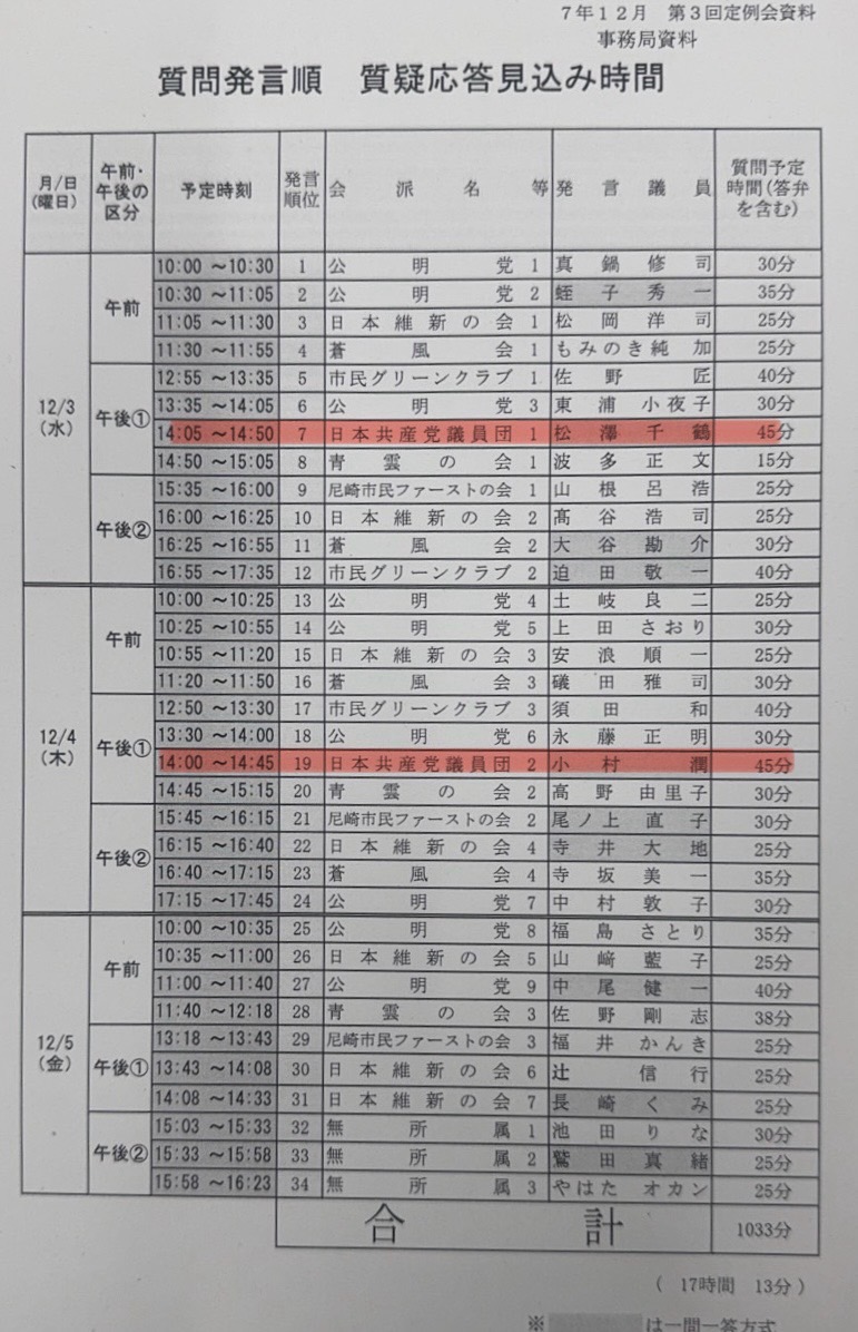 共産党議員団からは以下の予定で松沢、こむら両議員が一般質問に立ちます。