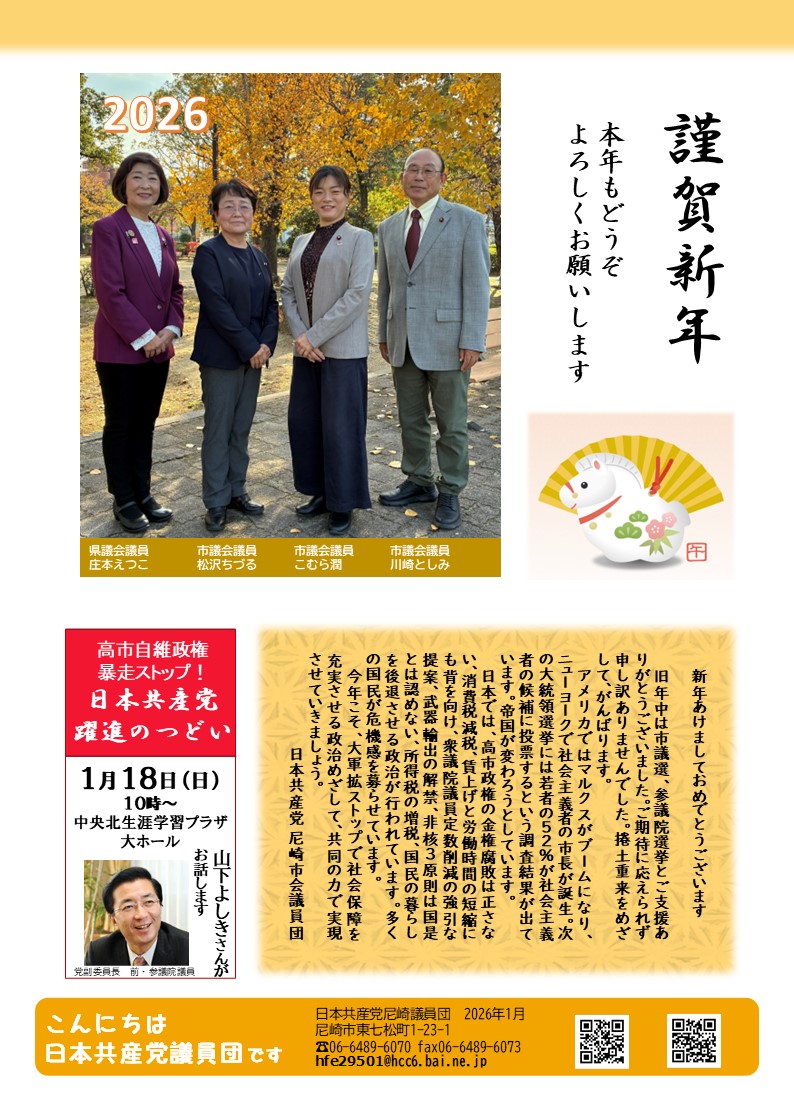 投稿者 jcp-amagasaki投稿日: 2026年1月1日2026年1月8日カテゴリー お知らせ, 団の活動, 市政情報タグ 団ニュース, 新年号